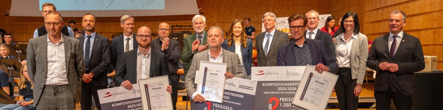 Aus über 47 Einreichungen beim Kompositionswettbewerb NEUE LITERATUR FÜR JUGENDBLASORCHESTER 2023/2024 konnten sich die Komponisten Florian Moitzi, Gerald Oswald und Andreas Ziegelbäck mit ihren für den Wettbewerb komponierten Stücken durchsetzen. Eine Vorjury ermittelte die elf besten Kompositionen, an denen die Komponisten anschließend in Workshops mit Jakob Gruchmann und Klemens Vereno & Franz Zaunschirm arbeiten konnten.